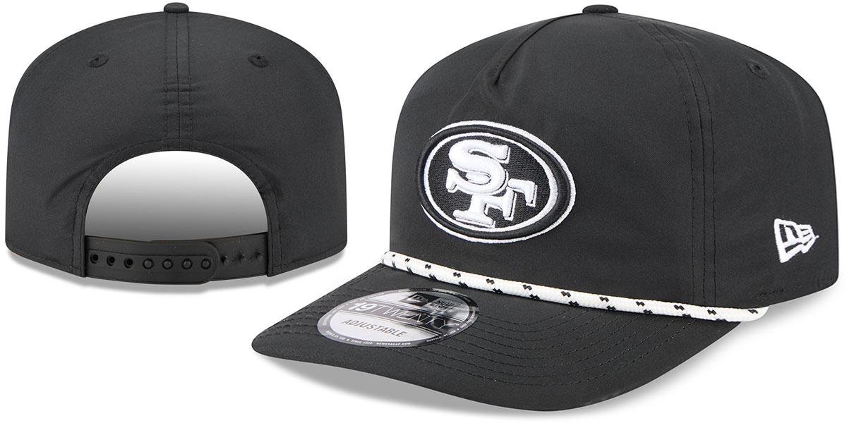 This 19TWENTY adjustable hat by New Era has a relaxed fit crown with pinched front panel construction and a mesh tray insert for light support. It has a poly nylon black crown and squared edge pre-curved visor with a black and white rope along brim. The undervisor is light grey, and the front sports a raised embroidered team logo in black and white. The side displays a matching embroidered New Era flag, and the back has an adjustable black rubber Snapback closure.. This San Francisco 49ers hat is made by New Era and is licensed by the NFL - National Football League.