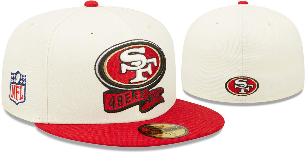 Authentic and ORIGINAL 59Fifty poly fitted hat by New Era, cream (off white-ivory) crown and team color red visor, red undervisor, embroidered team logo on front and team color banner with team name and conference below, team color embroidered New Era flag on side, embroidered NFL shield logo on opposite side, embroidered team logo on back, the official cap that players, coaches and staff will wear on the sidelines for the early games in the 2022 NFL season. This San Francisco 49ers hat is made by New Era and is licensed by the NFL - National Football League.