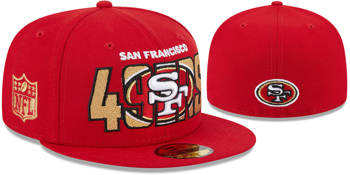 Authentic and ORIGINAL 59FIFTY fitted hat by New Era, team color red authentic poly deep crown and visor, light grey undervisor, large flat embroidered team name on front with raised embroidered team logo though block lettering, embroidered NFL shield logo on side in team colors, embroidered New Era logo on opposite side, embroidered team logo on back in team colors, The 59FIFTY hat worn during the 2023 NFL Draft. This San Francisco 49ers baseball cap is made by New Era and is licensed by the NFL National Football League.