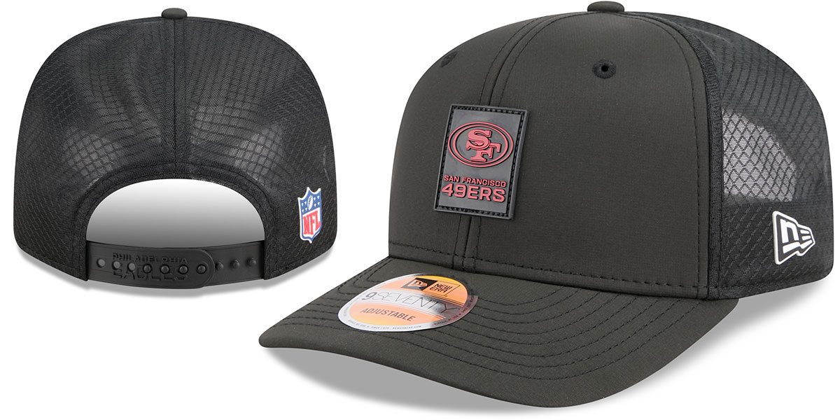 This Authentic New Era Low Profile 9SEVENTY Snapback is the official 2025 NFL Sideline cap worn by players, coaches, and staff. Designed with a structured black water-repellent Quill Tech crown, curved visor, and breathable mesh back panels. Features a quick-dry cushioned sweatband for comfort, silicone team logo patch on the front, jersey stripe applique under the brim, silicone New Era flag on the side, NFL Shield on the back, and an adjustable snapback closure.. This San Francisco 49ers hat is made by New Era and is licensed by the NFL - National Football League.