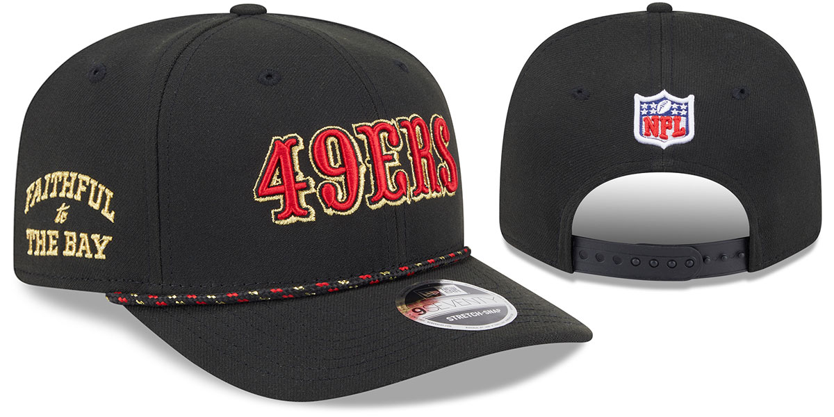 This Authentic New Era Low Profile 9SEVENTY Stretch-Snapback is the official 2025 cap worn by players, coaches, and staff during Rivalry weeks. Designed with a structured black rounded crown and curved visor with matching team color rope. Black undervisor. Raised embroidered team font logo on the front, embroidered New Era flag on the side, Faithful to the Bay embroidered on opposite side, NFL Shield on the back, and an adjustable snapback stretch closure.. This San Francisco 49ers hat is made by New Era and is licensed by the NFL - National Football League.
