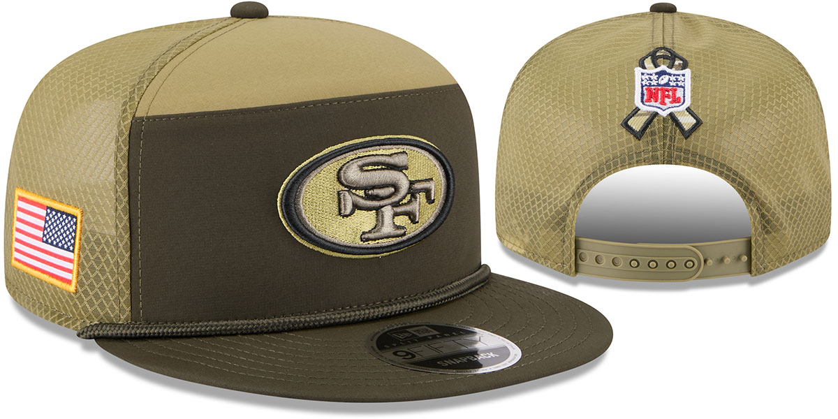 Show your support with the 49ers 2025 Salute to Service Split Panel 9FIFTY Trucker. This 100% Quill Tech polyester fabric cap features an embroidered team logo on the front, an NFL Salute to Service patch above the adjustable snapback closure, and an American flag patch on the right side. Rope embellishment extends across the visor. Finished with a silicone team logo on the dark green undervisor, while digi-camo fabric lines the interior for a bold finish. Proceeds from Salute to Service products benefit the NFL’s military nonprofit partners. This San Francisco 49ers hat is made by New Era and is licensed by the NFL - National Football League.