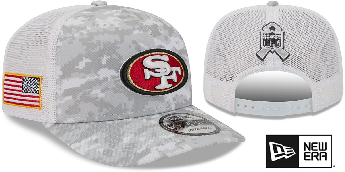 This Authentic New Era Low Profile 9SEVENTY Snapback is an official 2025 NFL cap worn by players, coaches, and staff. Featuring snow white and light grey digital desert storm camouflage crown and visor with white trucker middle and back panels, light grey undervisor, raised embroidered team logo on front in team colors, embroidered USA flag patch on side, dark grey embroidered New Era logo on opposite side, embroidered NFL shield logo on rear of hat with matching camo ribbon above white adjustable snapback closure. This is the style of hat worn by all NFL teams played on Salute to Service weekend. These commemorative caps honor our Armed Forces through patriotic themes that remind us all of the dedication of our troops. All proceeds from the NFL’s Salute to Service campaign are donated to the NFL’s three military appreciation nonprofit partners: USO, Pat Tillman Foundation, and Wounded Warrior Project. EACH CAMO HAT PATTERN WILL BE SLIGHTLY DIFFERENT SO NO TWO HATS WILL BE THE SAME. This San Francisco 49ers hat is made by New Era and is licensed by the NFL - National Football League.