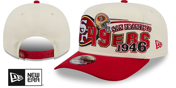 Adjustable A-FRAME five panel hat by New Era with pinched seam on front panels, chrome (cream) authentic poly crown and red visor with throwback dark kelly green undervisor, team classic logo flat embroidery on front across front panels, embroidered New Era logo on side, matching adjustable Snapback closure with team hangtag. This San Francisco 49ers hat is made by New Era and is licensed by the NFL - National Football League.