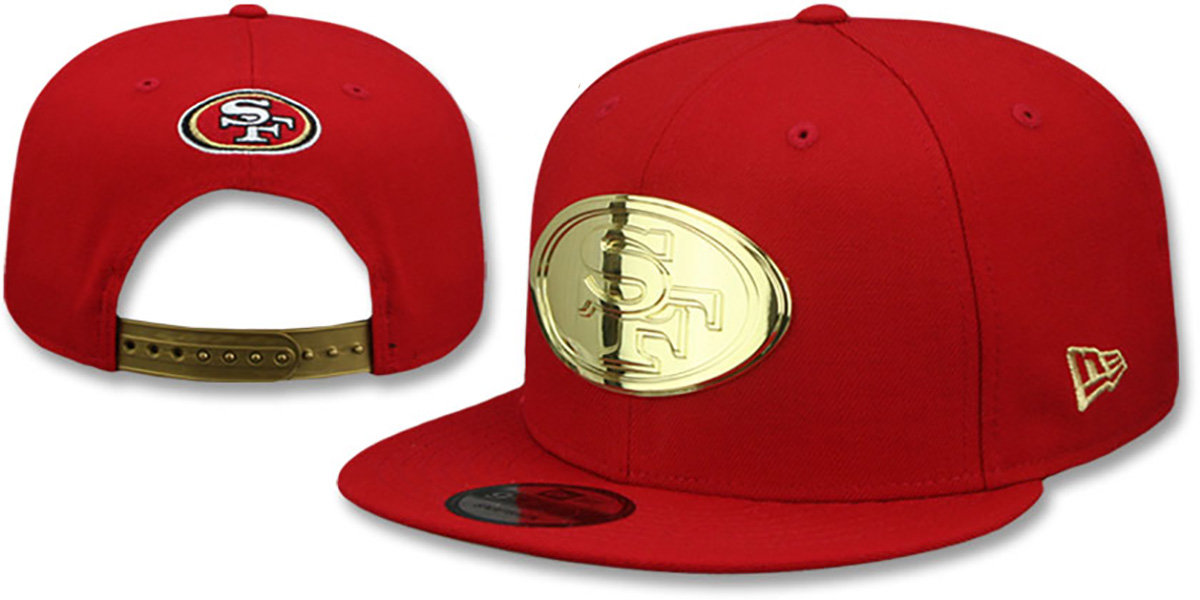 Original fit 9FIFTY adjustable wool hat by New Era that has similar deep crown and flat brim fit as the 59-Fifty, red crown and visor, light grey undervisor, gold chrome metal team logo attached to front, matching embroidered New Era logo on side, embroidered team font logo on back in team colors above matching gold adjustable snapback closure . This San Francisco 49ers hat is made by New Era and is licensed by the NFL - National Football League.