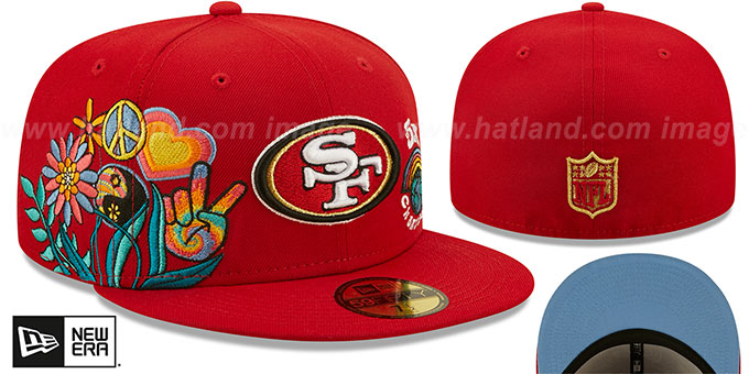 Authentic and Original 59FIFTY fitted hat by New Era, red authentic poly crown and visor, sky (light) blue undervisor, raised embroidered team logo on front with embroidered peace signs, hearts, and flowers around side, 5X CHAMPIONS Groovy embroidery to side of team logo, New Era embroidered logo on side, raised embroidered NFL shield logo on back. This San Francisco 49ers baseball cap is made by New Era and is licensed by the NFL - National Football League.