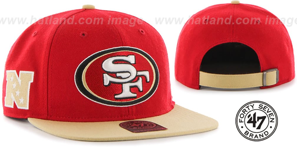 Authentic wool blend adjustable hat by Twins 47 Brand with original cut and flat brim, team color red crown and team color old gold (tan) visor, light grey undervisor, raised embroidered team logo on front, embroidered NFC logo on side, adjustable matching material Strapback with brass buckle snap closure. This San Francisco 49ers hat is made by 47 Brand and is licensed by the NFL National Football League.