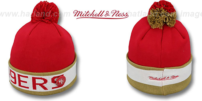 Team Color Red acrylic ribbed knit crown with old gold and white cuff, team name in knit stripe around front with team logo button, embroidered Michell & Ness logo on back, split team color Pom-Pom . This item is on SALE!. This San Francisco 49ers hat is made by Mitchell & Ness and is licensed by the NFL National Football League.
