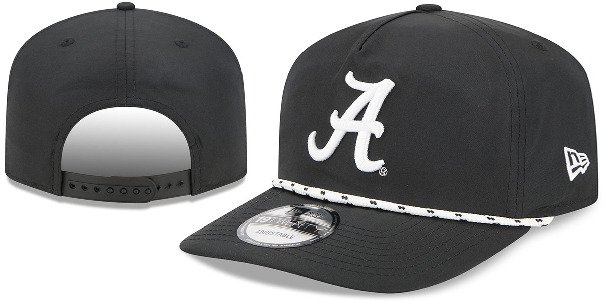 This 19TWENTY adjustable hat by New Era has a relaxed fit crown with pinched front panel construction and a mesh tray insert for light support. It has a poly nylon black crown and squared edge pre-curved visor with a black and white rope along brim. The undervisor is light grey, and the front sports a raised embroidered team logo in black and white. The side displays a matching embroidered New Era flag, and the back has an adjustable black rubber Snapback closure.. This Alabama Crimson Tide hat is made by New Era and is licensed by the NCAA - National Collegiate Athletics Association.