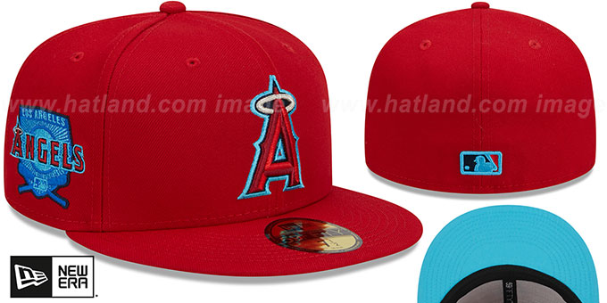 Authentic and ORIGINAL 59FIFTY poly fitted hat by New Era, red crown and visor with turquoise undervisor, raised embroidered team logo on front in team color with turquoise outline, team color embroidered New Era logo on side, exclusive matching embroidered MLB Fathers Day team logo patch on opposite side, matching raised embroidered MLB logo on back in turquoise with team color fill , The official hat worn by all MLB teams on Father's Day 2023 weekend. This Los Angeles Anaheim Angels baseball cap is made by New Era and is licensed by the MLB - Major League Baseball.