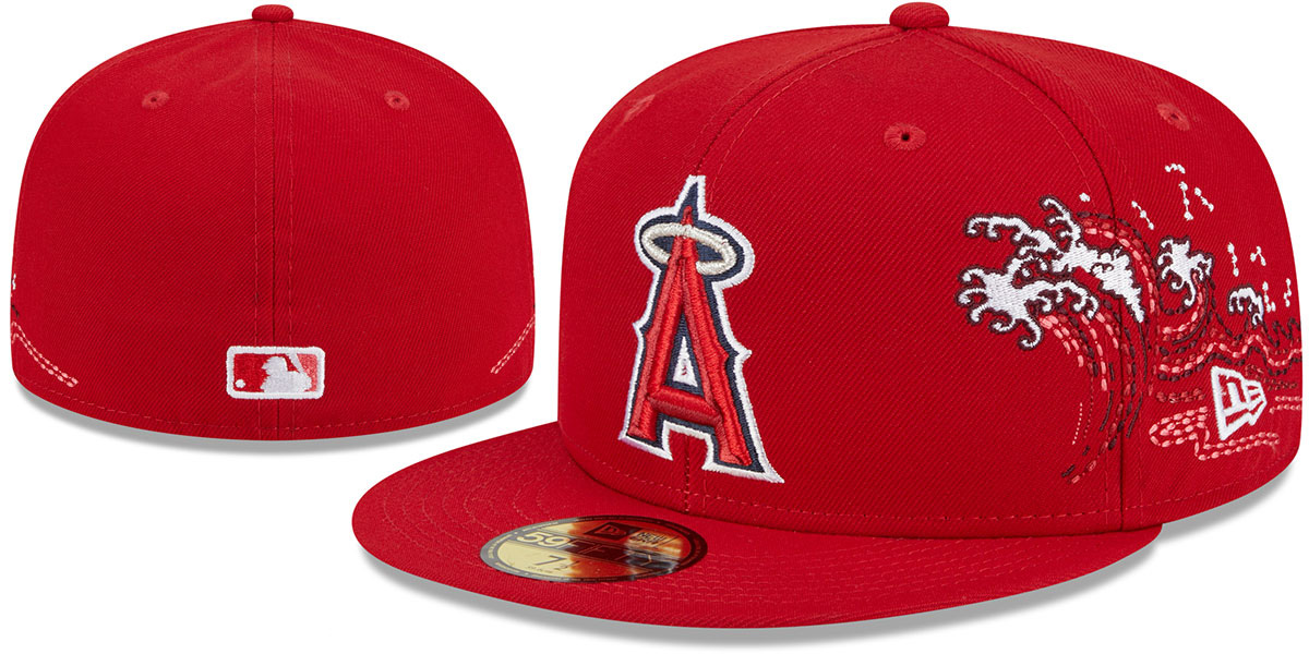 Authentic and Original 59FIFTY fitted hat by New Era, red authentic poly crown and visor, light grey undervisor, raised embroidered team logo on front with embroidered waves on each side of crown to side of team logo, New Era embroidered logo on side, matching embroidered MLB logo on back. This Los Angeles Anaheim Angels baseball cap is made by New Era and is licensed by the MLB - Major League Baseball.