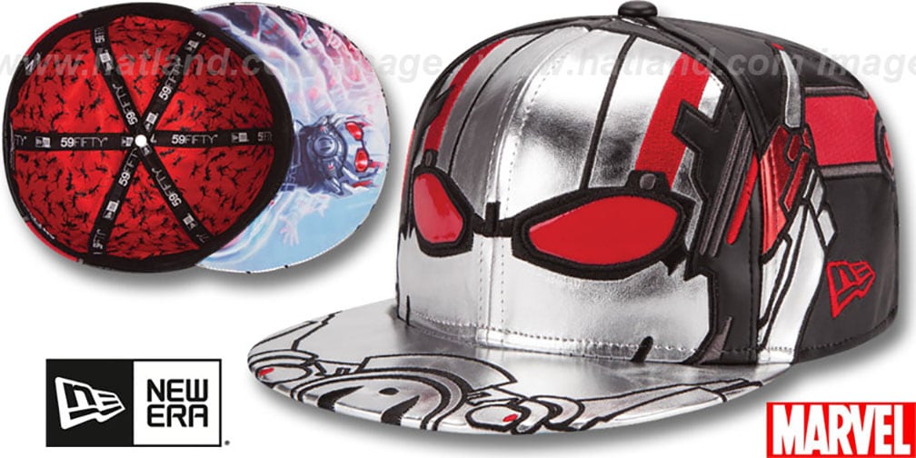 Authentic and ORIGINAL 59Fifty fitted hat by New Era, shiny polyurethane silver deep crown and visor with black faux leather and red honeycomb fabric around deep crown, embroidered Ant Man face logo on front panels, Hi-Res print undervisor, Hi-Res printed nylon All-Over ant printed lining, Officially licensed Marvel hat produced by and for the New Era Marvel Collection Collector's Item: Limited Edition release for the Ant Man movie. This Marvel Comics hat is made by New Era.