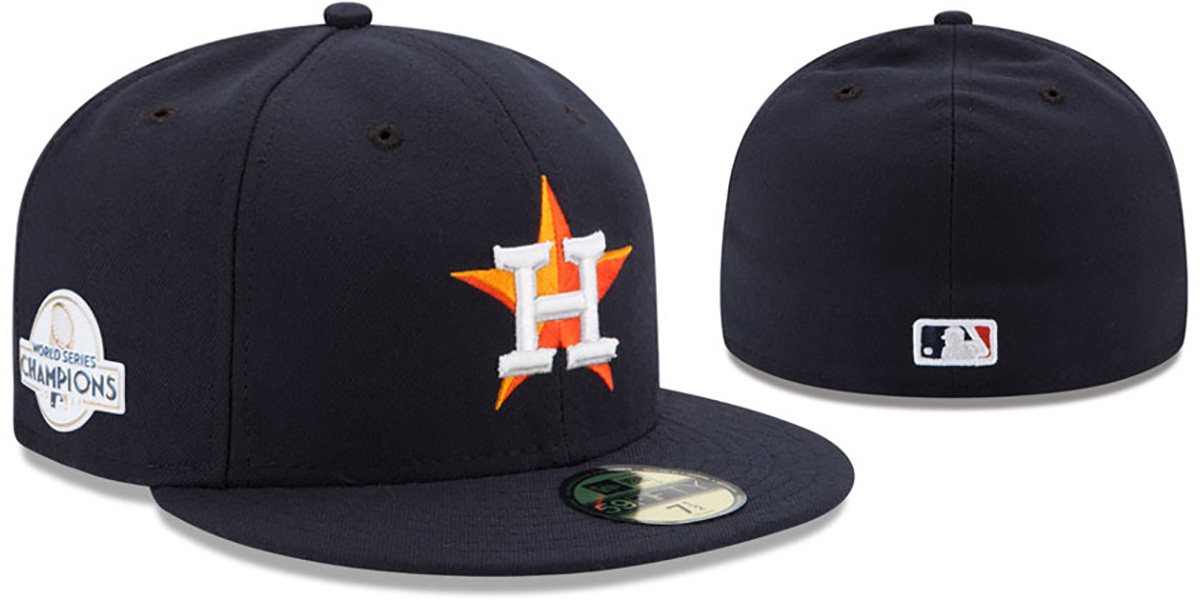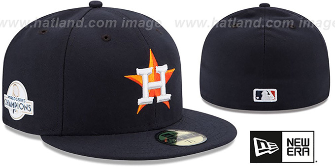 Authentic and ORIGINAL 59FIFTY fitted performance poly hat by New Era, navy blue deep crown and visor, black undervisor, raised embroidered team logo on front, Liquid Chrome 2017 WORLD SERIES CHAMPIONS patch on side, MLB logo on back. This Houston Astros baseball cap is made by New Era and is licensed by the MLB - Major League Baseball.