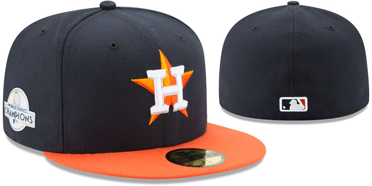 Authentic and ORIGINAL 59FIFTY fitted performance poly hat by New Era, navy blue deep crown and orange visor, black undervisor, raised embroidered team logo on front, Liquid Chrome 2017 WORLD SERIES CHAMPIONS patch on side, MLB logo on back. This Houston Astros baseball cap is made by New Era and is licensed by the MLB - Major League Baseball.