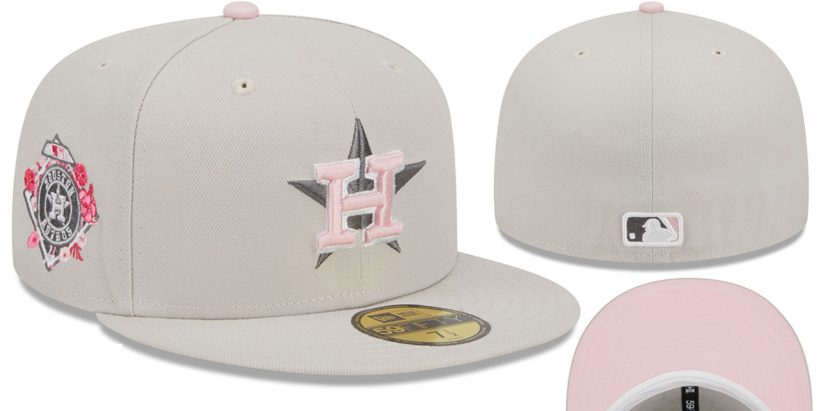 Authentic and ORIGINAL 59FIFTY fitted hat by New Era, light khaki (beige) authentic poly crown and visor, light pink undervisor, matching light pink raised embroidered team logo with outline, white embroidered New Era logo on side, matching embroidered side patch with secondary team logo, matching raised embroidered MLB logo on back , The official hat worn by all MLB teams for the Mother's Day 2023 games. This Houston Astros baseball cap is made by New Era and is licensed by the MLB - Major League Baseball.
