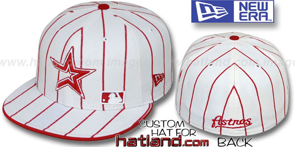 'Authentic' and Original 59FIFTY fitted hat, white cotton deep crown and visor with red pinstripes, matching red and white raised embroidered Alternate team logo on front with small raised 'Flawless' MLB logo, script matching team logo on back. This Houston Astros baseball cap is made by New Era and is licensed by the MLB - Major League Baseball.