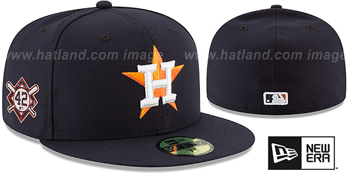 MLB Authentic Collection and ORIGINAL 59FIFTY fitted performance poly hat by New Era, dark navy blue crown and visor, black undervisor, raised embroidered team logo on front, embroidered New Era logo on side, Jackie Robinson liquid chrome patch on opposite side, raised embroidered MLB logo on back, This was the style of Onfield hat worn by all MLB teams during the MLB Jackie Robinson day. This Houston Astros baseball cap is made by New Era and is licensed by the MLB - Major League Baseball.