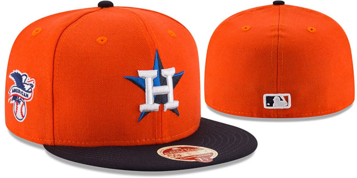 Authentic and ORIGINAL 59Fifty wool fitted hat by New Era from the HERITAGE SERIES, orange deep crown with navy blue visor, grey undervisor, raised embroidered team logo on front, embroidered American League logo on side, New Era logo on opposite side, matching embroidered MLB logo on back. This Houston Astros hat is made by New Era and is licensed by the MLB - Major League Baseball.