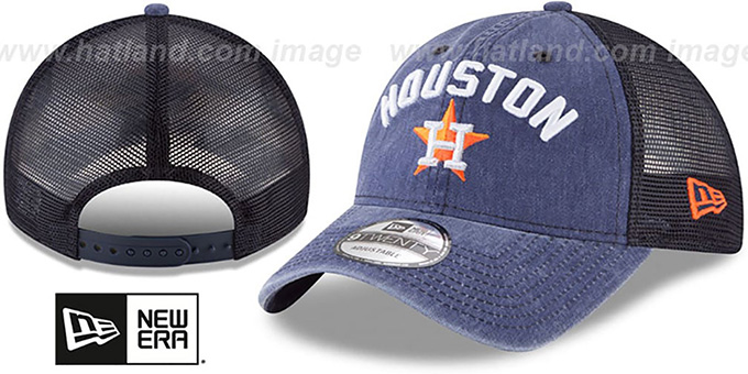 Low Profile 9TWENTY slouch fit trucker hat by New Era, distressed light navy blue lightly structured rounded crown and visor that appears washed, navy blue trucker mesh mid and back panels, navy undervisor, raised embroidered team city name on front arched over team logo, New Era flag on side, matching adjustable Snapback strap on back. This Houston Astros hat is made by New Era and is licensed by the MLB - Major League Baseball.