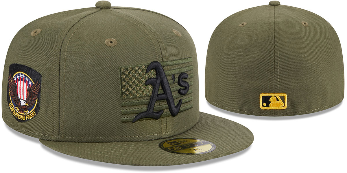 This authentic and original 59FIFTY fitted performance poly hat by New Era features a moss olive green crown and visor with a light grey undervisor. The tonal raised embroidered USA flag and team logo in black and olive are displayed on the front, while an embroidered exclusive Armed Forces patch is on the side and the New Era logo in metallic gold is on the opposite side. The back showcases a matching MLB logo in metallic gold with black fill. This is the official on-field hat worn by all MLB teams during the 2023 Armed Forces weekend. These commemorative caps honor our Armed Forces through patriotic themes, and a portion of the proceeds from the sale of these 'Stars & Stripes' caps supports the Welcome Back Veterans Fund, an organization that provides assistance to veterans and their families when they return home from overseas. This Oakland Athletics baseball cap is made by New Era and is licensed by the MLB - Major League Baseball.