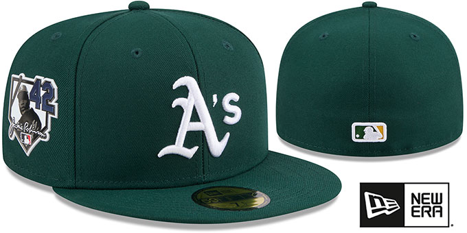MLB Authentic Collection and ORIGINAL 59FIFTY fitted hat by New Era, dark green authentic poly crown and visor, kelly green undervisor with 42 in black, Jackie Robinson picture and stats on the inside front panels, raised embroidered Cooperstown team logo on front, embroidered New Era logo on side, rubberized Jackie Robinson homeplate patch on opposite side, raised embroidered MLB logo on back in team colors, This is the style of Onfield hat worn by all MLB teams during the 2026 MLB Jackie Robinson Day. This Oakland Athletics baseball cap is made by New Era and is licensed by the MLB - Major League Baseball.