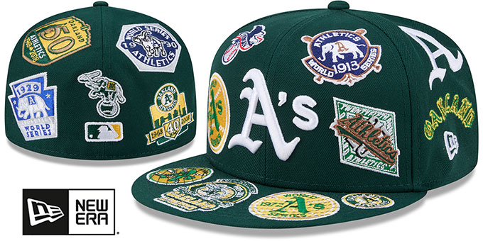 Authentic and ORIGINAL 59Fifty fitted hat by New Era, dark green authentic poly deep crown and visor with a light grey undervisor, raised embroidered team logo on front, embroidered Cooperstown and associated team logos embroidered ALL-OVER crown and visor, embroidered MLB Batterman logo on back. This Oakland Athletics hat is made by New Era and is licensed by the MLB - Major League Baseball.