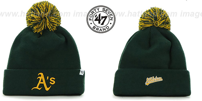 Dark green ribbed knit crown and cuff with embroidered MLB team logo on cuff, two team color pom-pom on top, small embroidered Twins 47 Brand patch on side, secondary team logo embroidery on back. This item is on SALE!. This Oakland Athletics hat is made by 47 Brand and is licensed by the MLB Major League Baseball.
