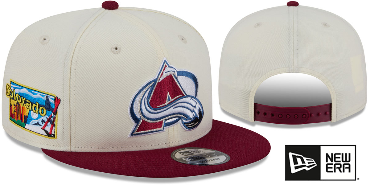 Original 9FIFTY adjustable poly hat by New Era that has similar deep crown and flat brim fit as the 59-Fifty, chrome (cream off white) crown with burgundy visor, kelly green undervisor, raised embroidered team logo on front in team colors, embroidered New Era logo on side, embroidered Localized Colorado state logo on side, team color adjustable Snapback closure. This Colorado Avalanche hat is made by New Era and is licensed by the NHL - National Hockey League.