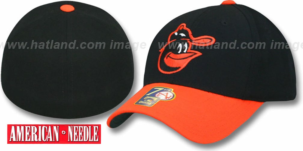Structured fitted hat, black acrylic/wool blend rounded crown with orange precurved visor, dark green under visor. authentic Cooperstown, Old Schoolfit by American Needle. This Baltimore Orioles hat is made by American Needle and is licensed by the MLB - Major League Baseball.