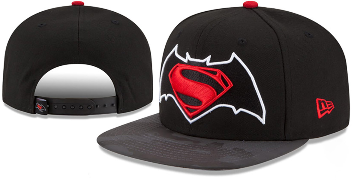 Original fit 9FIFTY adjustable authentic poly hat by New Era that has similar deep crown and flat brim fit as the 59-Fifty, black crown with black and grey reflective Batman VS Superman battle on visor, light grey undervisor, raised embroidered Batman VS Superman logo on front, embroidered New Era logo on side, matching adjustable Snapback strap, One Size Fits Most adult sizing, officially licensed DC Comics hat produced by and for the New Era Superhero Collection and Batman VS Superman movie. This DC Comics hat is made by New Era.