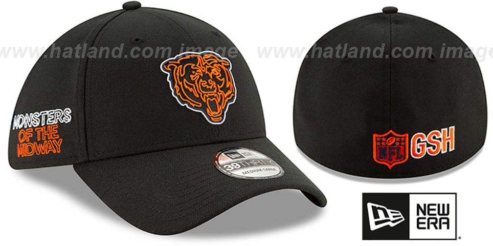 New Era 39THIRTY stretch fit hat with black authentic poly blend crown and visor, black undervisor, raised silicone team logo attached to front, embroidered team slogan on side, embroidered New Era logo on opposite side, raised embroidered NFL shield logo on back in team colors This Flex 39THIRTY hat fits approximate head sizes (Sm / Med 6 7/8 - 7 1/4) (Med / Lg 7 1/4 - 7 5/8) (Lg / XLg 7 5/8 - 8 ). This Chicago Bears hat is made by New Era and is licensed by the NFL - National Football League.