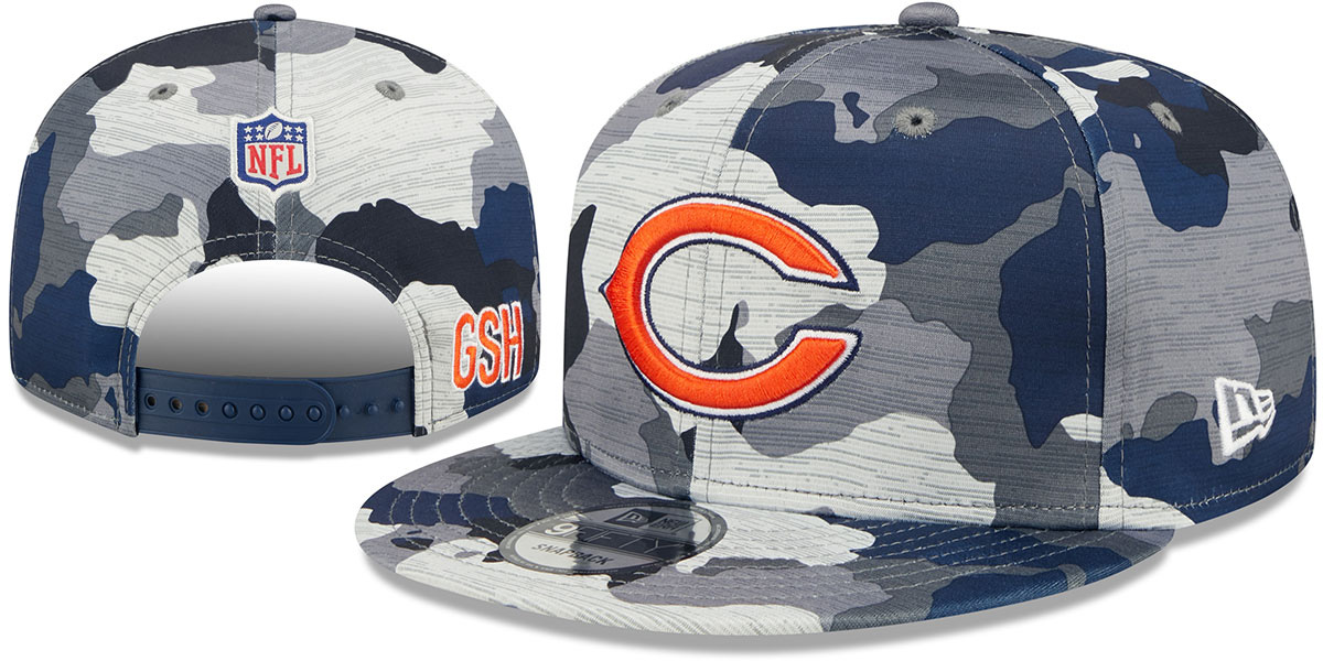 The 9FIFTY adjustable hat by New Era features a deep crown and flat brim similar to the 59-Fifty. It has a camo poly/spandex crown and visor in the team's colors, a navy blue undervisor, and a raised embroidered team logo on the front. The side has an embroidered New Era logo, and the back has a raised embroidered NFL shield logo above the adjustable snapback closure. This 9FIFTY SNAPBACK hat was worn during the 2022 NFL Training Camps. This Chicago Bears hat is made by New Era and is licensed by the NFL - National Football League.