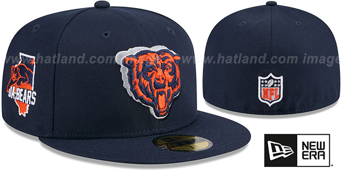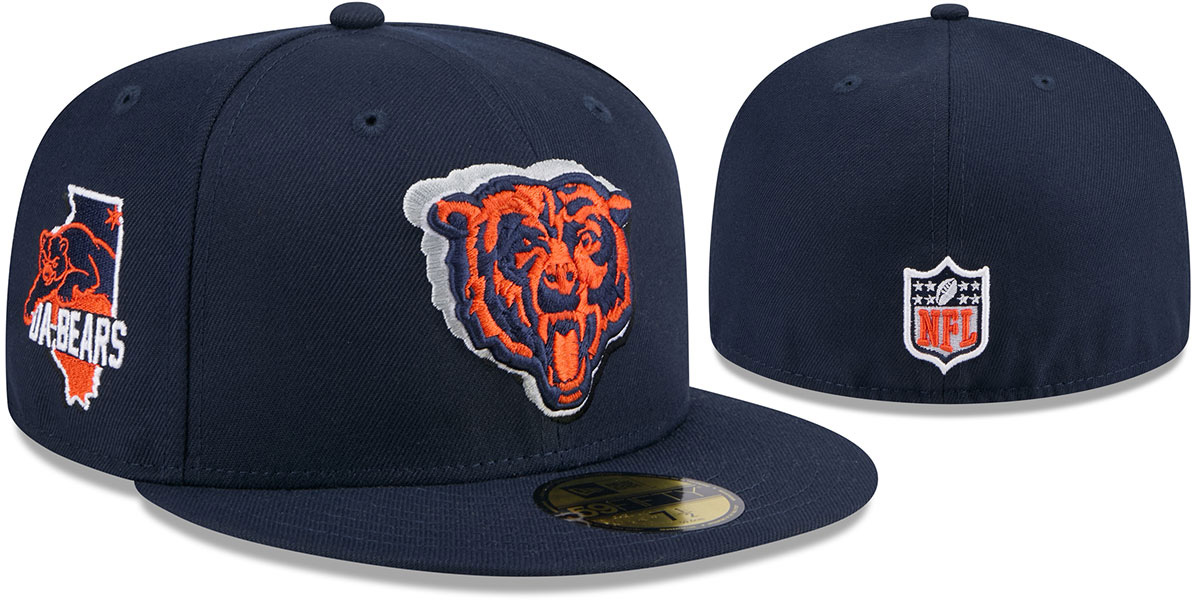 Authentic and ORIGINAL 59FIFTY fitted hat by New Era, navy blue authentic poly deep crown and visor, light grey undervisor, raised embroidered team logo on front with silver shadow effect, Illinois 'DA-BEARS' side-patch. embroidered team color NFL shield logo on back. embroidered New Era logo on opposite side, The 59FIFTY hat worn during the 2024 NFL Draft. This Chicago Bears baseball cap is made by New Era and is licensed by the NFL National Football League.