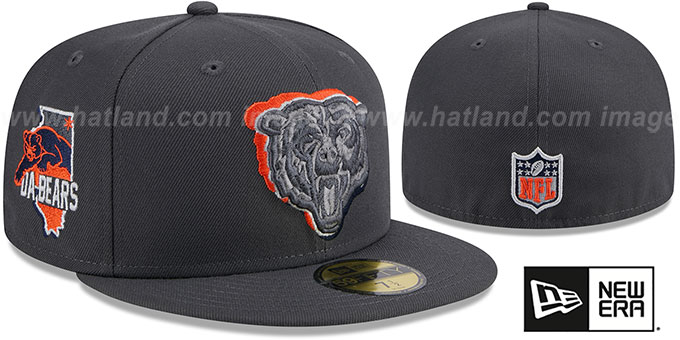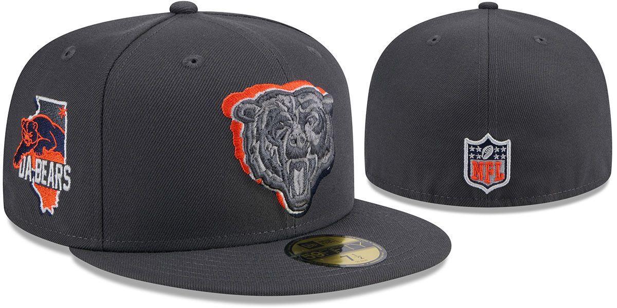 Authentic and ORIGINAL 59FIFTY fitted hat by New Era, charcoal gray authentic poly deep crown and visor, light grey undervisor, raised embroidered gray-tone team logo on front with team color shadow effect, Illinois 'DA-BEARS' side-patch. embroidered team color NFL shield logo on back. embroidered New Era logo on opposite side, The 59FIFTY hat worn during the 2024 NFL Draft. This Chicago Bears baseball cap is made by New Era and is licensed by the NFL National Football League.