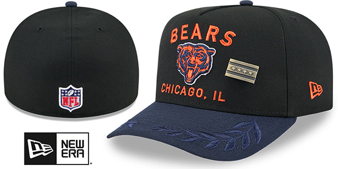 Original fit 59FIFTY A-Frame hat by New Era that has deep 5-panel crown and slightly curved brim, black authentic poly crown with high-profile pinched front panels and navy blue visor with tonal embroidered leaf pattern, light grey undervisor, embroidered team name with raised embroidered team logo on front with detachable pin with butterfly clasp, embroidered New Era logo on side, embroidered NFL shield logo on back, The 59FIFTY hat worn during the 2025 NFL Draft. This Chicago Bears baseball cap is made by New Era and is licensed by the NFL National Football League.