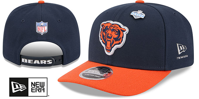 This New Era Low Profile 9SEVENTY STRETCH SNAP hat features a navy blue rounded crown with orange slightly precurved visor and 2026 NFL Draft pin on crown, light grey undervisor, team inspired print on inside front panels, embroidered team logo on front with liquid chrome outline, liquid chrome New Era logo on side, liquid chrome NFL shield logo on back above team color snap with team name in liquid chrome, This is the 9SEVENTY stretch snapback style of hat worn by all NFL players during the 2026 NFL Draft. This Chicago Bears hat is made by New Era and is licensed by the NFL - National Football League.