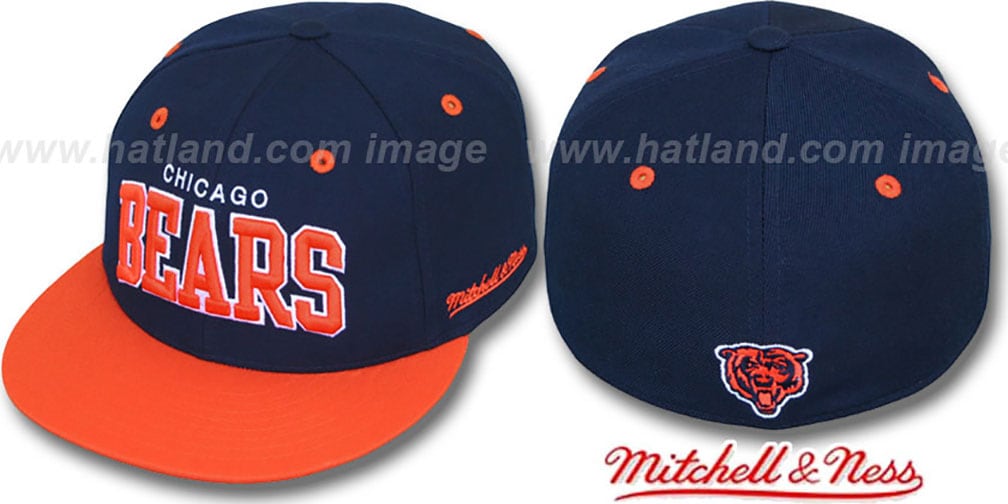 'Authentic' wool fitted hat by Mitchell & Ness with original cut and flat brim, navy crown with orange visor and undervisor, raised embroidered Classic Throwback, Old School 'Arched' team name logo on front, Mitchell & Ness script embroidery on side, team logo embroidered on back. This Chicago Bears hat is made by Mitchell & Ness and is licensed by the NFL - National Football League.