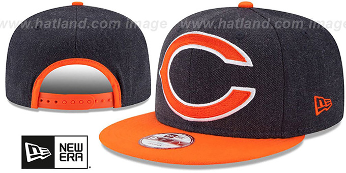 Original fit 9FIFTY adjustable wool blend hat by New Era that has similar deep crown and flat brim fit as the 59-Fifty, heather navy blue crown and orange visor, light grey undervisor, raised embroidered Logo Grand oversized team logo on front, embroidered New Era logo on side, arched matching material on back above plastic adjustable Snapback strap. This Chicago Bears hat is made by New Era and is licensed by the NFL National Football League.