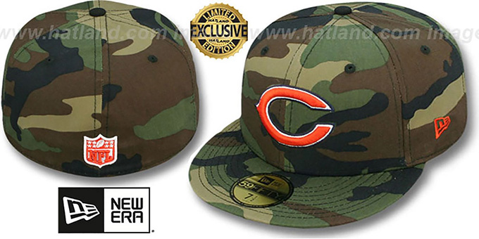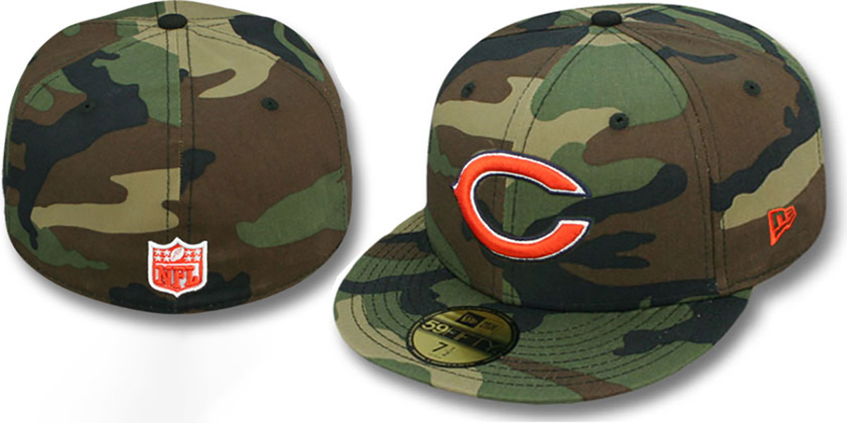 Authentic and ORIGINAL 59FIFTY fitted hat by New Era, woodland (army) camouflage (tan, brown, green and black) cotton deep crown and visor with light grey undervisor, raised embroidered team logo on front in team color, embroidered New Era flag on side, matching raised embroidered NFL shield logo on back, EACH CAMO HAT PATTERN WILL BE SLIGHTLY DIFFERENT SO NO TWO HATS WILL BE THE SAME. This Chicago Bears baseball cap is made by New Era and is licensed by the NFL - National Football League.