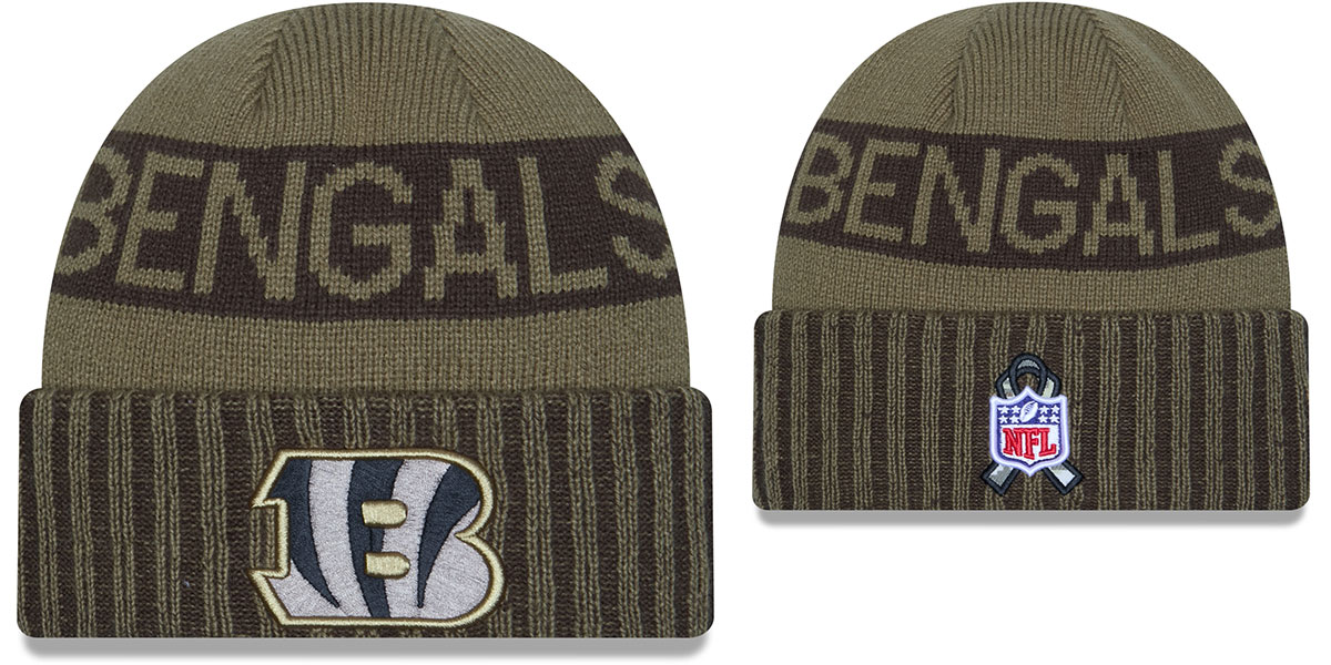 Show your pride on and off the field with the 2025 Salute to Service Cuff Knit. This cold-weather essential features the Bengals logo at the front, a bold team wordmark across the crown, and tribute details including the American flag patch on the side and the official NFL Salute to Service patch at the back. Built for warmth and comfort with 100% Acrylic Crown & Cuff and 90% Polyester/10% Wool Lining. It’s more than just game-day gear—it’s a way to honor those who serve. Every purchase helps support the NFL’s military nonprofit partners. Hand wash, dry flat. This Cincinnati Bengals hat is made by New Era and is licensed by the NFL National Football League.
