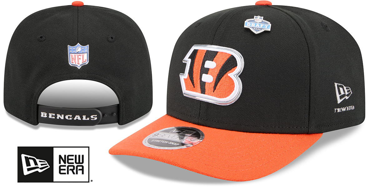 This New Era Low Profile 9SEVENTY STRETCH SNAP hat features a black rounded crown with orange slightly precurved visor and 2026 NFL Draft pin on crown, light grey undervisor, team inspired print on inside front panels, embroidered team logo on front with liquid chrome outline, liquid chrome New Era logo on side, liquid chrome NFL shield logo on back above team color snap with team name in liquid chrome, This is the 9SEVENTY stretch snapback style of hat worn by all NFL players during the 2026 NFL Draft. This Cincinnati Bengals hat is made by New Era and is licensed by the NFL - National Football League.