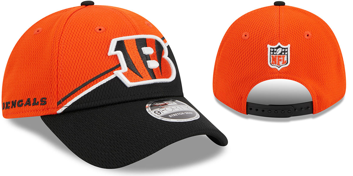This is the New Era 9FORTY snapback hat worn by players during the start of the 2023 NFL season. It features a lightly structured, adjustable mesh design with a curved brim. The upper front and middle/back panels are orange, while the lower front panels and visor are black. The front has a raised, embroidered team logo with diagonal stripes in the team colors. Additional embroidered logos are on the sides, and the NFL shield is above the adjustable snapback closure. This Cincinnati Bengals hat is made by New Era and is licensed by the NFL - National Football League.