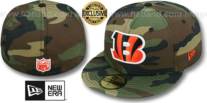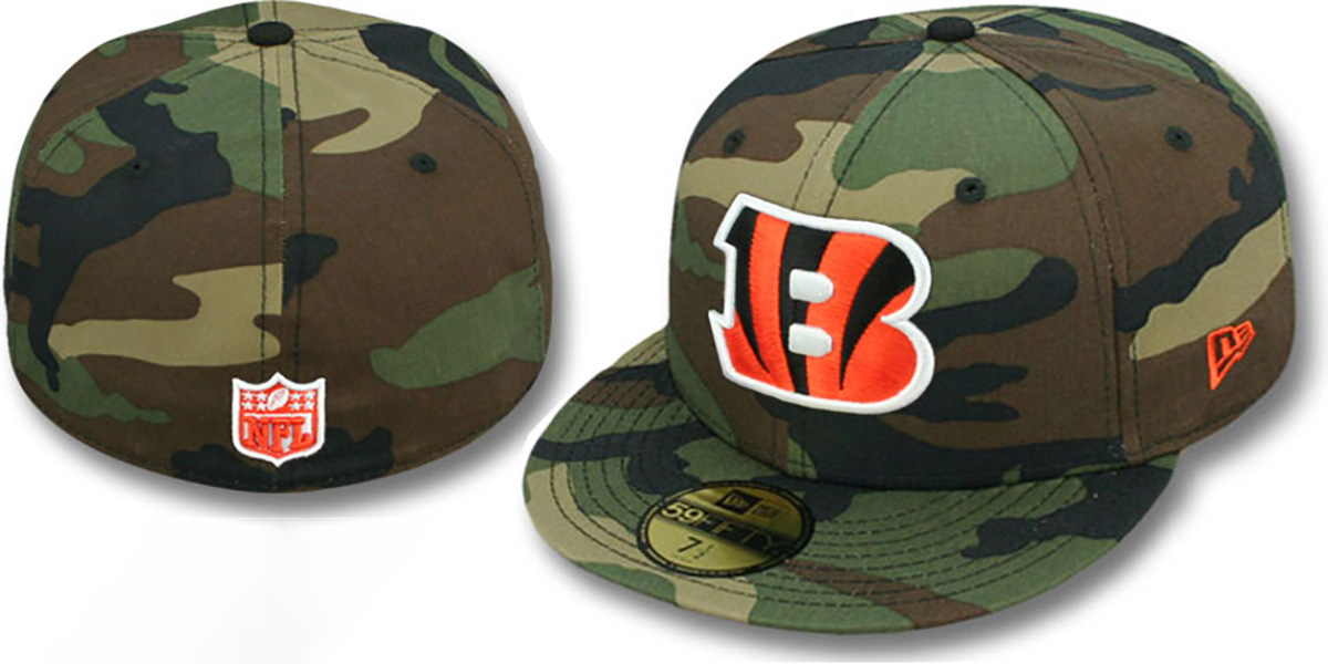 Authentic and ORIGINAL 59FIFTY fitted hat by New Era, woodland (army) camouflage (tan, brown, green and black) cotton deep crown and visor with light grey undervisor, raised embroidered team logo on front in team color, embroidered New Era flag on side, matching raised embroidered NFL shield logo on back, EACH CAMO HAT PATTERN WILL BE SLIGHTLY DIFFERENT SO NO TWO HATS WILL BE THE SAME. This Cincinnati Bengals baseball cap is made by New Era and is licensed by the NFL - National Football League.