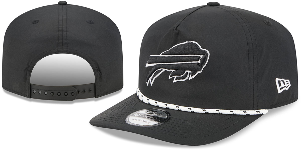 This 19TWENTY adjustable hat by New Era has a relaxed fit crown with pinched front panel construction and a mesh tray insert for light support. It has a poly nylon black crown and squared edge pre-curved visor with a black and white rope along brim. The undervisor is light grey, and the front sports a raised embroidered team logo in black and white. The side displays a matching embroidered New Era flag, and the back has an adjustable black rubber Snapback closure.. This Buffalo Bills hat is made by New Era and is licensed by the NFL - National Football League.