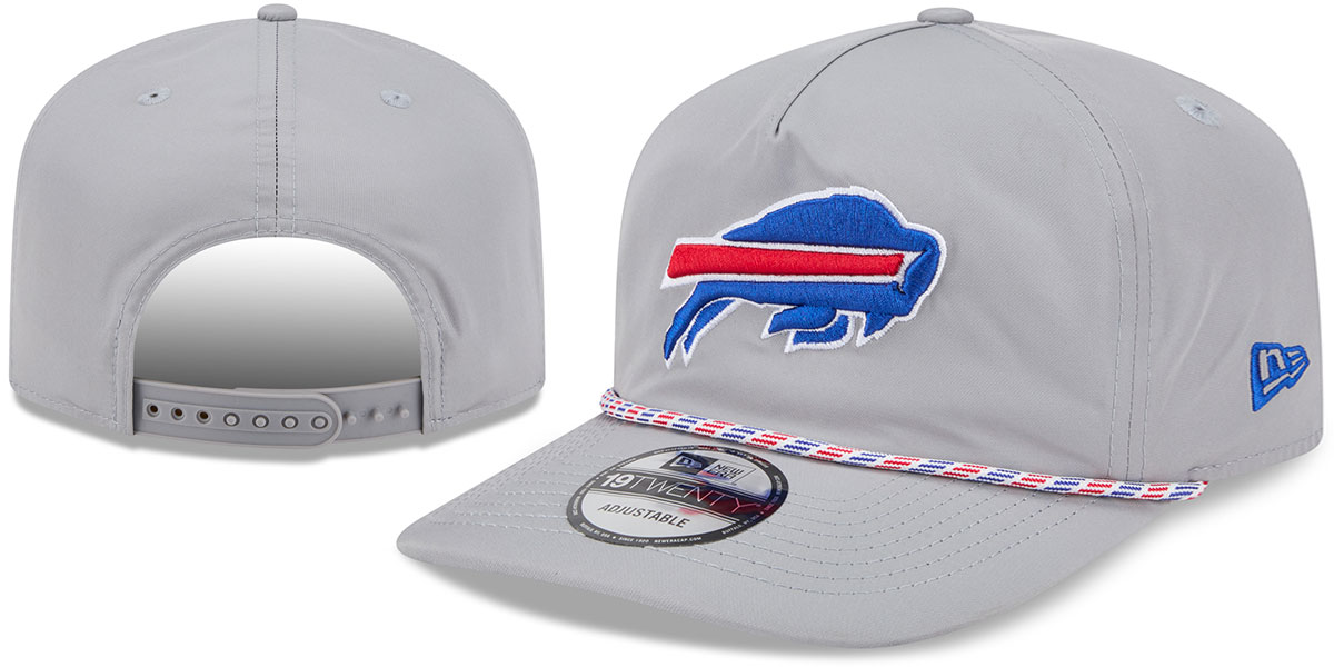 This 19TWENTY adjustable hat by New Era has a relaxed fit crown with pinched front panel construction and a mesh tray insert for light support. It has a poly nylon light grey crown and squared edge pre-curved visor with a team color rope along brim. The undervisor is light grey, and the front sports a raised embroidered team logo in team colors. The side displays a matching embroidered New Era flag, and the back has an adjustable light grey rubber Snapback closure.. This BUFFALO BILLS hat is made by New Era and is licensed by the NFL - National Football League.