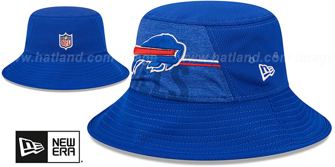 New Era bucket hat with team color royal blue heather poly mesh front panels, royal blue perforated soft mesh middle and back panels and brim, light grey undervisor, raised embroidered team logo on front and matching embroidered stripes above tonal printed team name, embroidered New Era logo on side, embroidered NFL Shield logo applique patch on back, This is the style of hat worn by all NFL teams during Training Camp of the 2023 season, this is a flex bucket with black drawstring with clips that can be taken off if preferred Adult Sizing - One Size Fits Most - Approximate sizing 7 1/8 thru 7 3/4. This Buffalo Bills hat is made by New Era and is licensed by the NFL - National Football League.