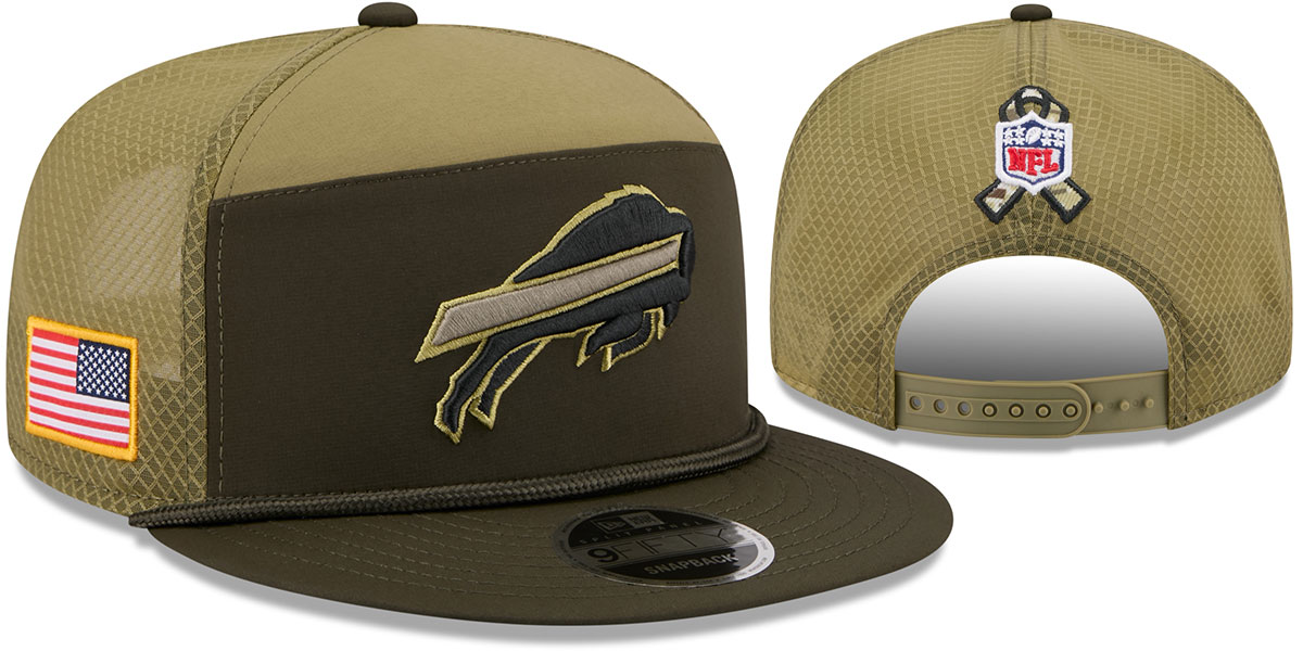 Show your support with the Bills 2025 Salute to Service Split Panel 9FIFTY Trucker. This 100% Quill Tech polyester fabric cap features an embroidered team logo on the front, an NFL Salute to Service patch above the adjustable snapback closure, and an American flag patch on the right side. Rope embellishment extends across the visor. Finished with a silicone team logo on the dark green undervisor, while digi-camo fabric lines the interior for a bold finish. Proceeds from Salute to Service products benefit the NFL’s military nonprofit partners. This Buffalo Bills hat is made by New Era and is licensed by the NFL - National Football League.