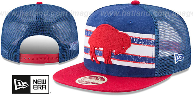 Original fit 9FIFTY authentic poly adjustable hat by New Era that has similar deep crown and flat brim fit as the 59-Fifty, royal blue front panels with team color tattered and worn horizontal stripes, royal trucker mesh middle and back panels, red visor and undervisor, raised embroidered Throwback team logo on front, matching New Era logo on side, matching team color snapback closure, One Size adult sizing - One Size Fits Most. This Buffalo Bills hat is made by New Era and is licensed by the NFL - National Football League.
