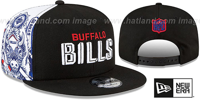Original fit 9FIFTY authentic poly hat by New Era that has similar deep crown and flat brim fit as the 59-Fifty, black crown and visor, black undervisor, team card print on white side panel in team colors, raised embroidered team name on front, embroidered New Era flag on side, NFL shield logo on back in team colors above black adjustable Snapback strap closure. This Buffalo Bills hat is made by New Era and is licensed by the NFL - National Football League.