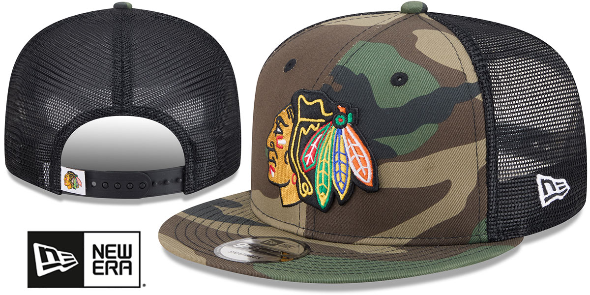 Original 9FIFTY fit adjustable poly meshback hat by New Era that has similar deep crown and flat brim fit as the 59-Fifty, army (woodland) camo cotton front panels and visor with black mesh middle and back panels, light grey undervisor, raised embroidered team logo on front in team colors, embroidered white New Era logo on side, black adjustable snapback closure with team logo hangtag. This Chicago Blackhawks hat is made by New Era and is licensed by the NHL - National Hockey League.